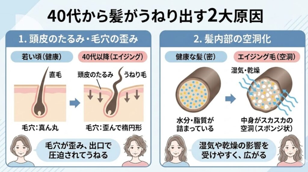 歪んだ毛穴から生えてくる髪は、出口で圧迫されるため、最初からうねった状態で生えてきてしまうのです。 これが、いわゆる「エイジングによるくせ毛」の正体です。