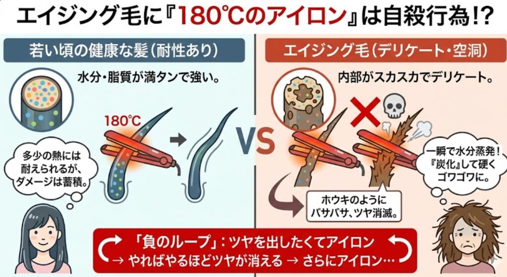 若い頃の健康な髪なら、ある程度の熱には耐えられました。 しかし、先ほどお伝えしたように、エイジング毛はデリケートでスカスカの状態です。そこに180℃の鉄板を押し当てるとどうなるか。 髪は一瞬で水分を失い、「炭化(たんか)」して硬くなります。