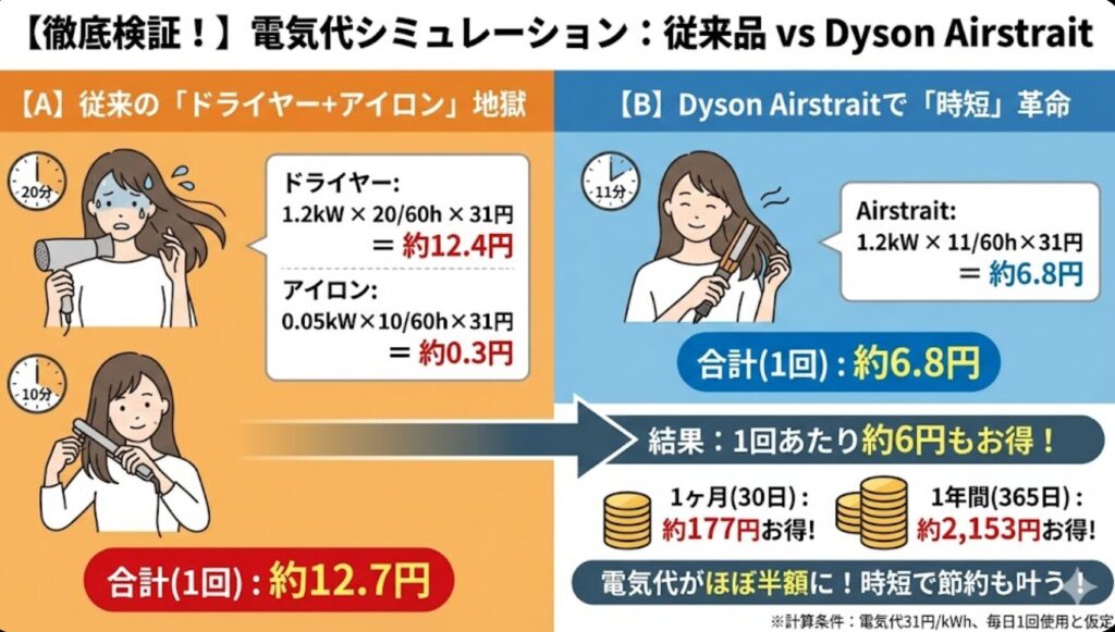 | 項目 | 従来のルーティン | Dyson Airstrait | 差額(節約額) |