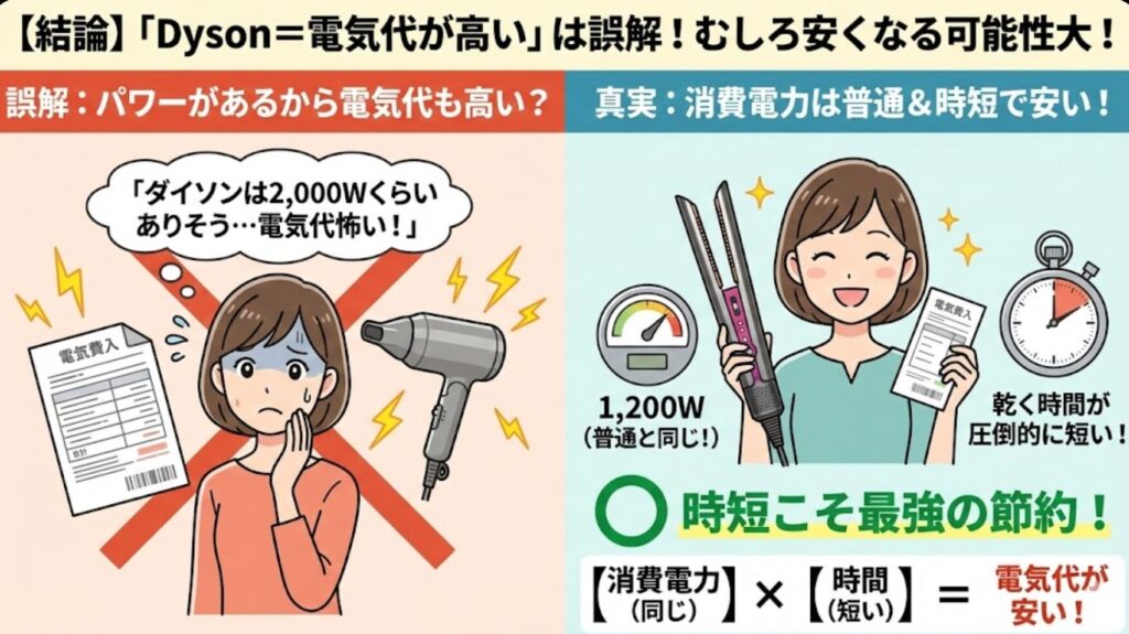 Dyson Airstraitの電気代は、普通のドライヤーより安くなる可能性が高いです。