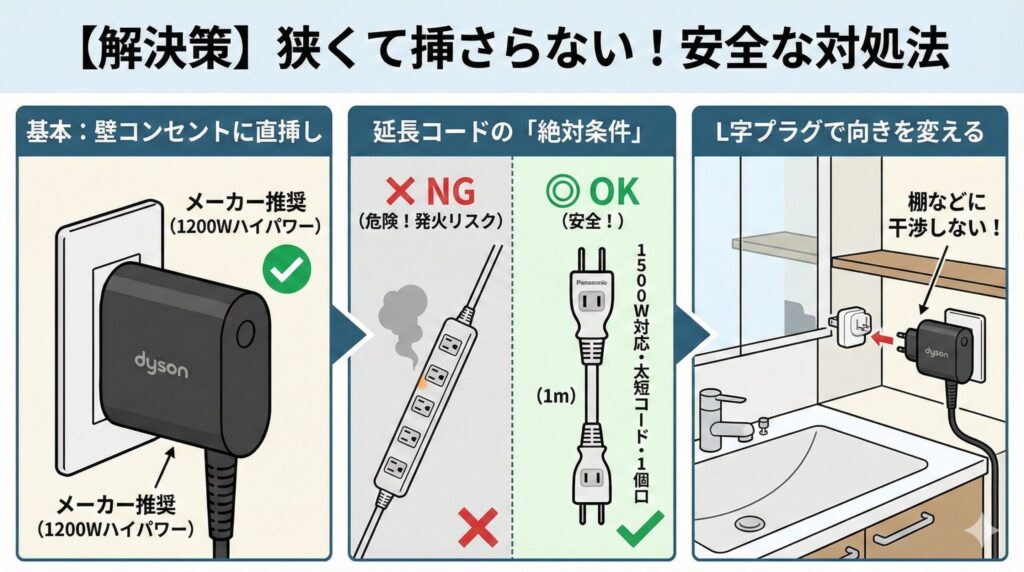 挿さらない場合は、「1500W対応・1個口」のしっかりした延長コードや、L字プラグを活用する。