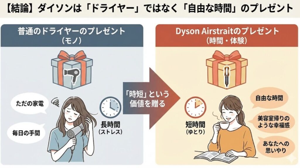 Dyson Airstraitは、その苦痛な時間を「半分の時間で、ただ撫でるだけ」に変えてくれます。つまり、これは家電ではなく、奥様を労(ねぎら)う「優しさの塊」なんですね。