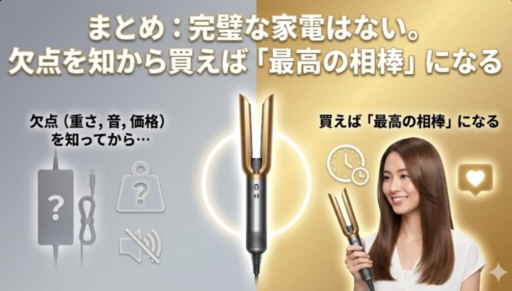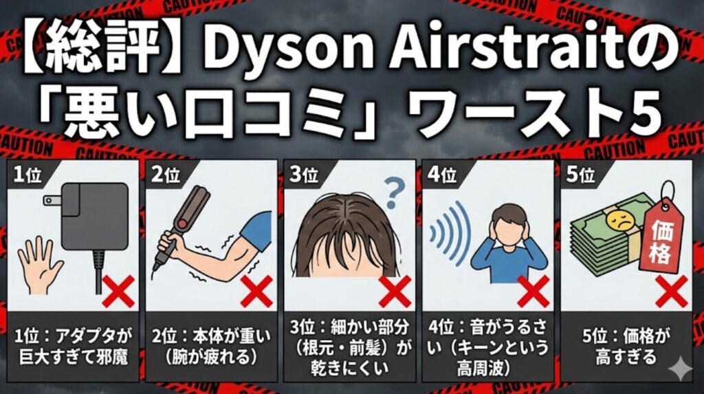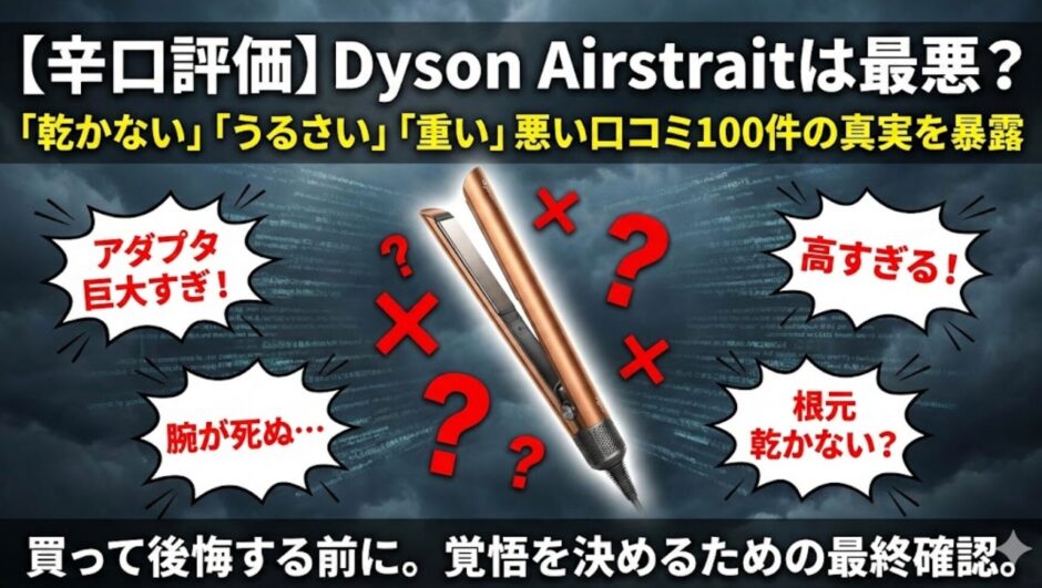 そこで今回は、Dyson Airstrait(ダイソン エアストレート)の購入を検討している人が「絶対に知っておくべき欠点」を包み隠さず公開します。 ネット上の辛口な口コミを100件以上リサーチし、それが「許容範囲」なのか「やっぱりナシ」なのか、実際に毎日使い込んでいる私がジャッジしました。