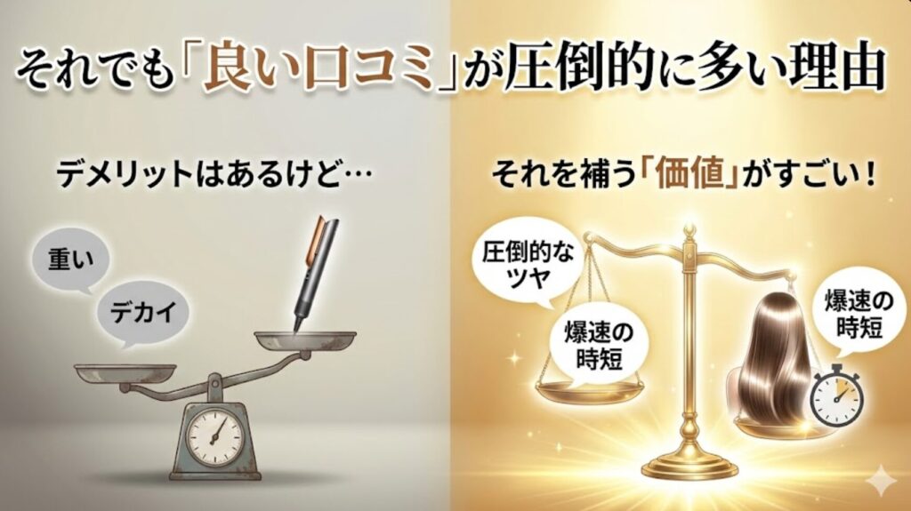 悪い口コミを書いている人たちも、実は最後にこう付け加えています。 「重いしデカイけど、この仕上がりがあるから手放せない」