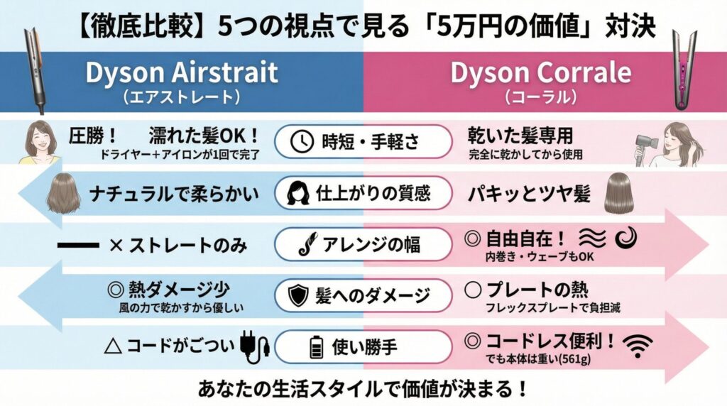この記事では、Dysonの2大巨頭「Airstrait(エアストレート)」と「Corrale(コーラル)」を徹底比較します。あなたの「ズボラ度」や「理想の朝」から逆算して、「どちらが5万円払う価値がある正解か」を白黒はっきりつけましょう!