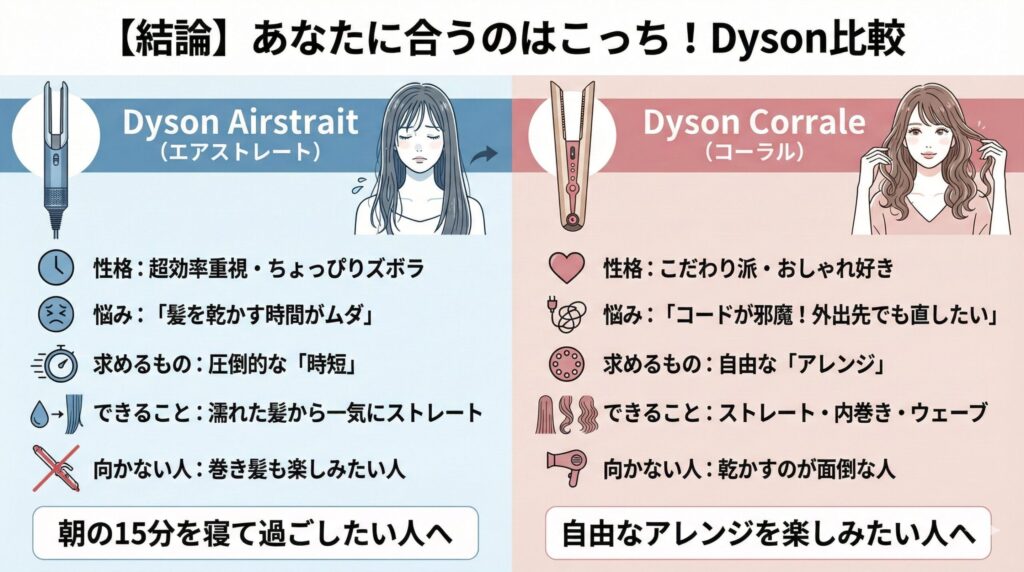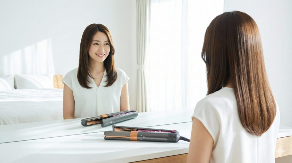 あなたが「朝の15分を寝て過ごしたい」なら、迷わずAirstraitです。逆に、「その日の気分で内巻きにしたり、前髪を繊細に整えたい」なら、Corraleじゃないと後悔します。