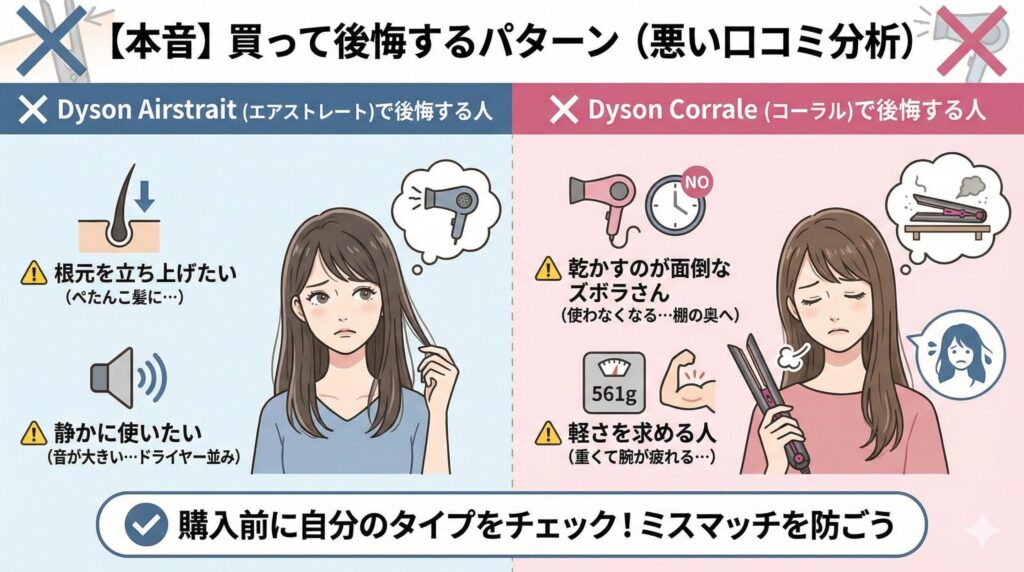 | 判定 | Dyson Airstrait (エアストレート) | Dyson Corrale (コーラル) |