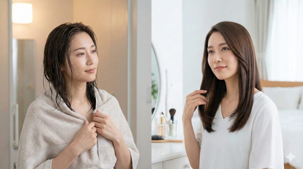 お風呂上がり、タオルドライした髪にそのまま使えます。「ドライヤーで乾かす」→「アイロンをする」という2段階工程が1回で終わる。これは革命です。 - Corrale: