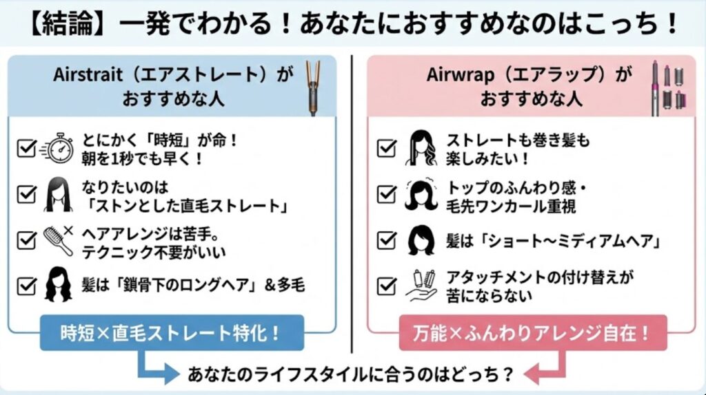 「広がりを抑えたい」ならAirstrait、「ペタンコ髪をどうにかしたい」ならAirwrapが向いています。