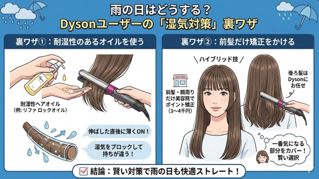 耐湿性のあるオイルを使うDysonで伸ばした直後に、湿気をブロックするタイプのヘアオイル(リファのロックオイルなど)を薄くつける。これだけで持ちが全然ちがいます。