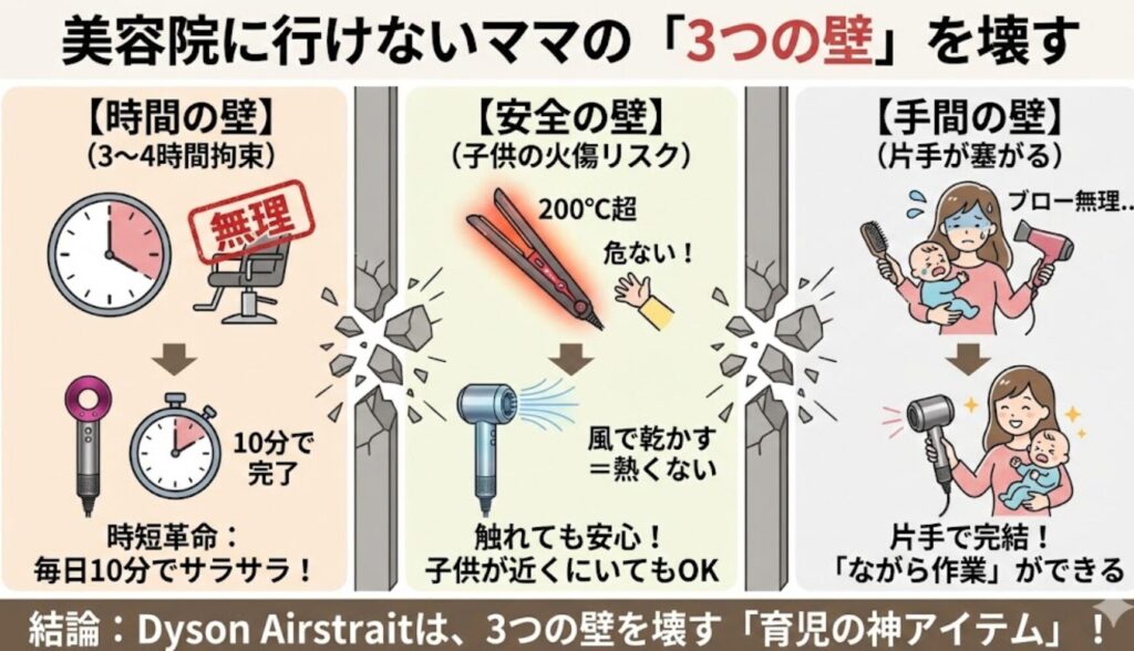 美容院に行く手間や交通費、そして「誰かに子供を預ける心苦しさ」まで考えると、実は1年ちょっとで元が取れてしまうんです。Dyson Airstraitは、贅沢品ではありません。