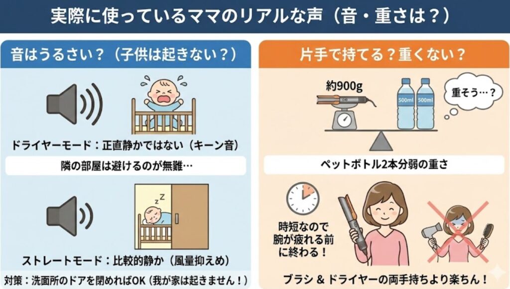 「重そう…」と思うかもしれませんが、髪を乾かす時間が圧倒的に短いので、腕が疲れる前に終わります。むしろ、ブラシとドライヤーを両手で持つより、片手で済むので楽ちんです。