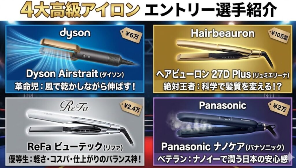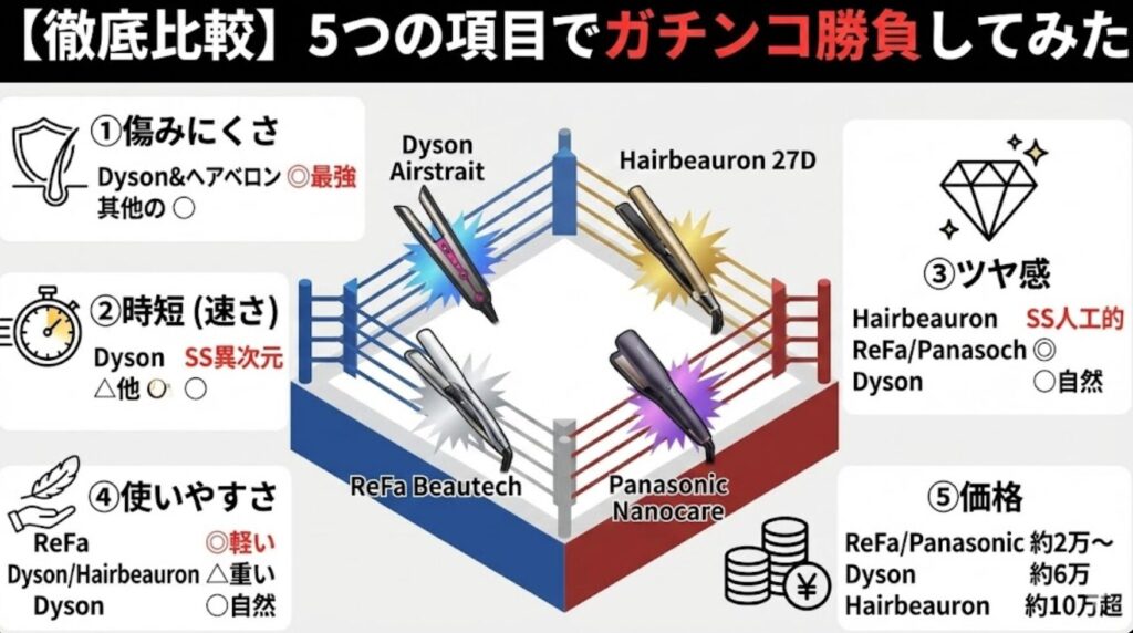 そんな迷えるあなたのために、今回は人気の4大機種(Dyson、ヘアビューロン、ReFa、Panasonic)を徹底的に比較しました。結論から言うと、「何を最優先するか」で正解は変わります。