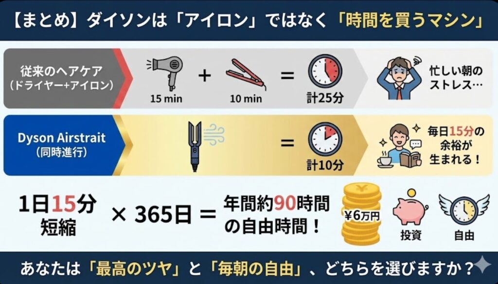 「時は金なり」と言いますが、毎朝の15分をチャリンチャリンとお金に換算したら、ダイソンの5万円なんてすぐに元が取れてしまいます。